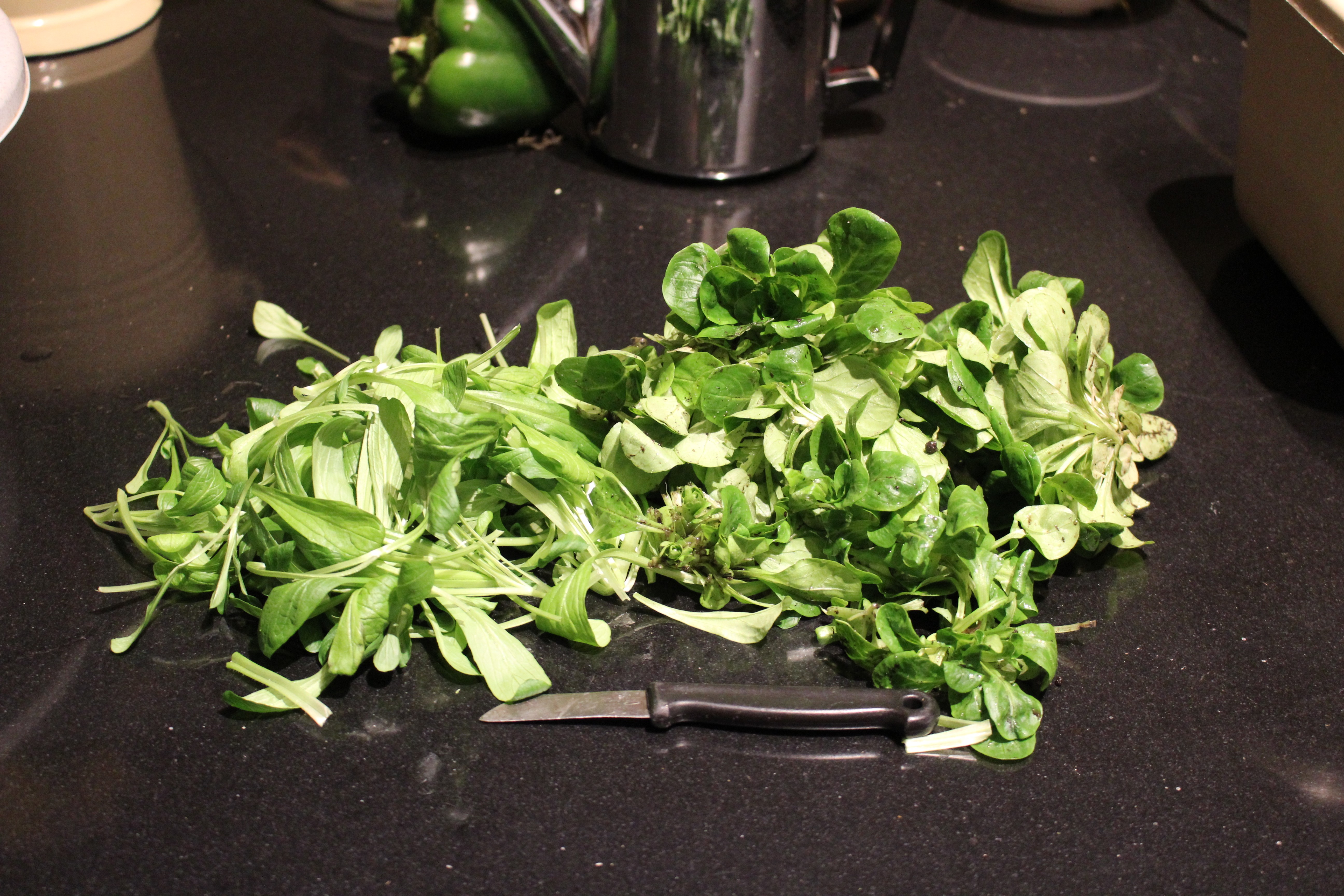 Daarna heb ik de la-sla uit de sla-la geoogst. Toevallig op dezelfde dag veldsla in het groentepakket, de eerste van het jaar. Kleinere blaadjes, maar wel stukken milieuvriendelijker: de La-sla heeft ongeveer 46 kWh gekost… (nov2018-jan2019: 92 dagen x 504 Wh per dag: 16 uur per dag licht 30W, schakelklok 1W 24 uur per dag. De LED’s zelf zijn 9W, de rest zit in de stroombron en de ventilator. Het kan dus zuiniger… Maar ik ga er van uit dat het een eenmalige (woord)grap is. Als ik b.v. aardbeien of munt in de la ga zetten maak ik ‘m eerst wel zuiniger… Andere ventilator, vooral…)